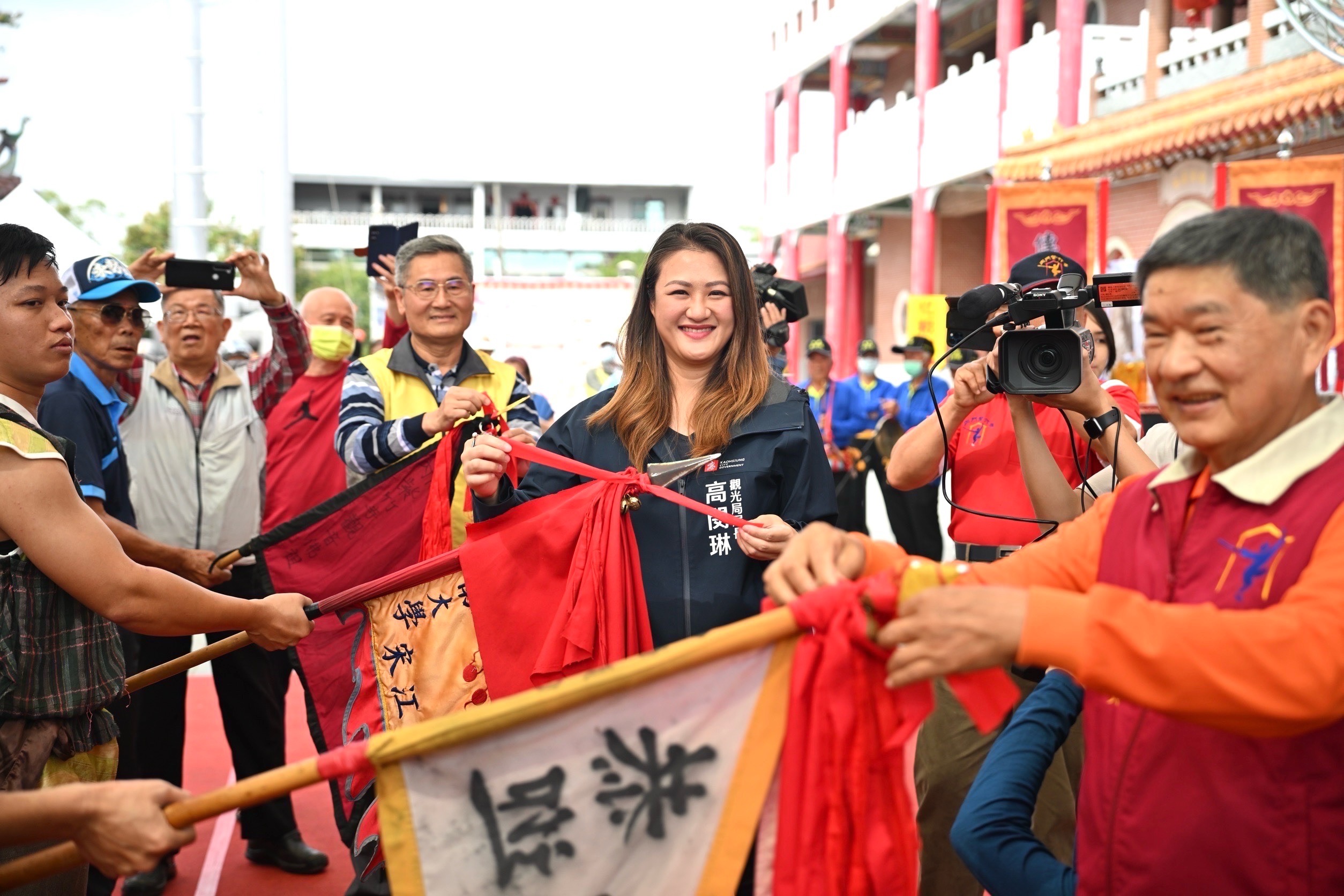 ↑圖說:何國昭師父(左)遞交象徵最高榮譽的冠軍旗予觀光局長高閔琳(右),祝福參賽隊伍旗開得勝。(圖片來源:高雄市觀光局提供)