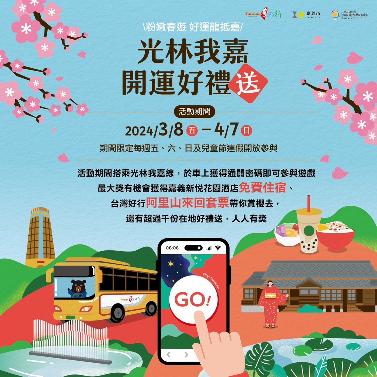 「光林我嘉開運好禮送」活動將於3/8(五)至4/7(日)期間,每週五六日、以及兒童連假4天開放,只要搭乘嘉市台灣好行光林我嘉線公車、並掃描活動QRcode加入官方Line帳號,就可以免費進行旅遊開運占卜遊戲,每日都有超過250份獎品,最大獎有機會抽中四連霸「最美飯店」的嘉義新悅花園酒店免費平日住宿券;另外適逢阿里山櫻花季,每週六日將加碼抽出台灣好行阿里山線來回車票,阿里山風景區管理處也獨家提供限量餐具組加碼送,浪漫粉嫩櫻花季出遊就來嘉義!