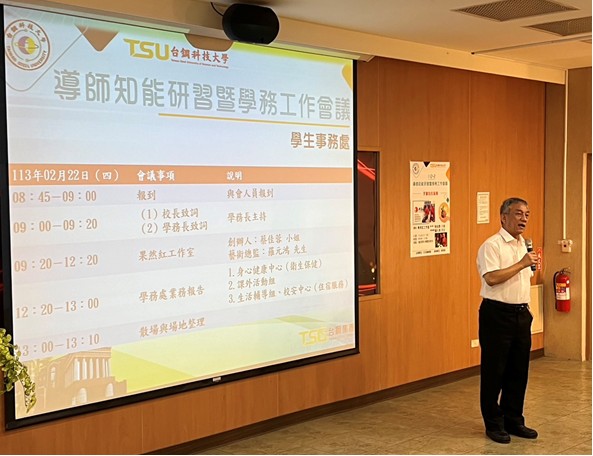 講座前由學務長蔡文彬開場致詞,並再次強調台鋼科技大學經過目標朝向 「開源、節流、招生」3大方向,密切與高雄科學園區合作,縮小學校規模至7個系所,以上有賴導師們積極對外招生,讓台鋼科大「重新擦亮招牌」。