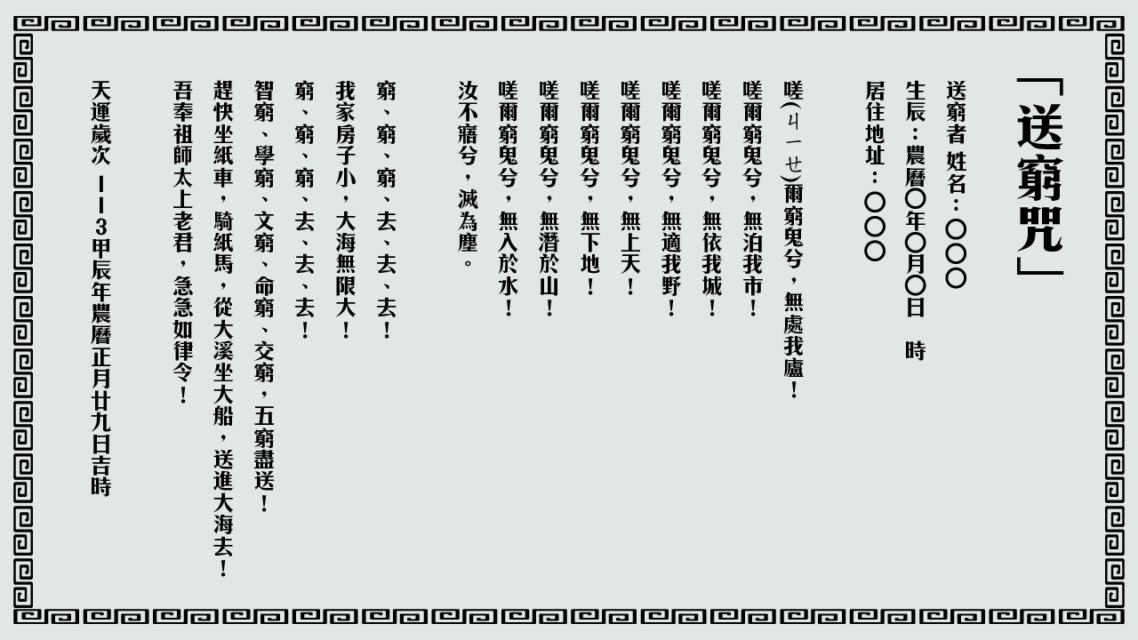 圖:送窮咒,先送窮再迎富貴,正月晦日先送走「窮鬼」擺脫貧窮,然後二月二日再向土地公求財。(來源:谷帥臻老師)