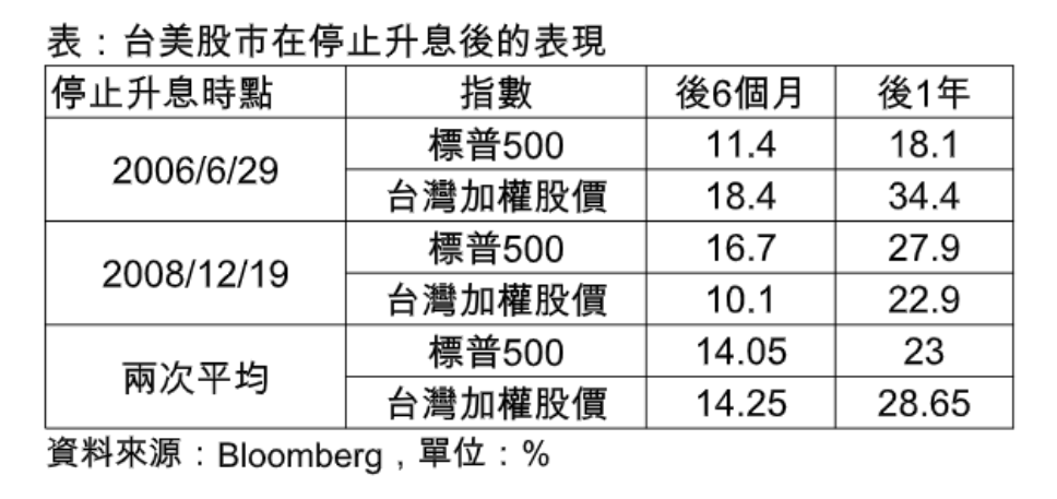 根據Bloomberg統計,前二次停止升息的時間點落在2006年與2008年,美國標普500指數在升息告終後的六個月與一年平均漲幅為14.05%與23%,而台股同期間表現更優於美股,平均漲幅分別為14.25%與28.65%。