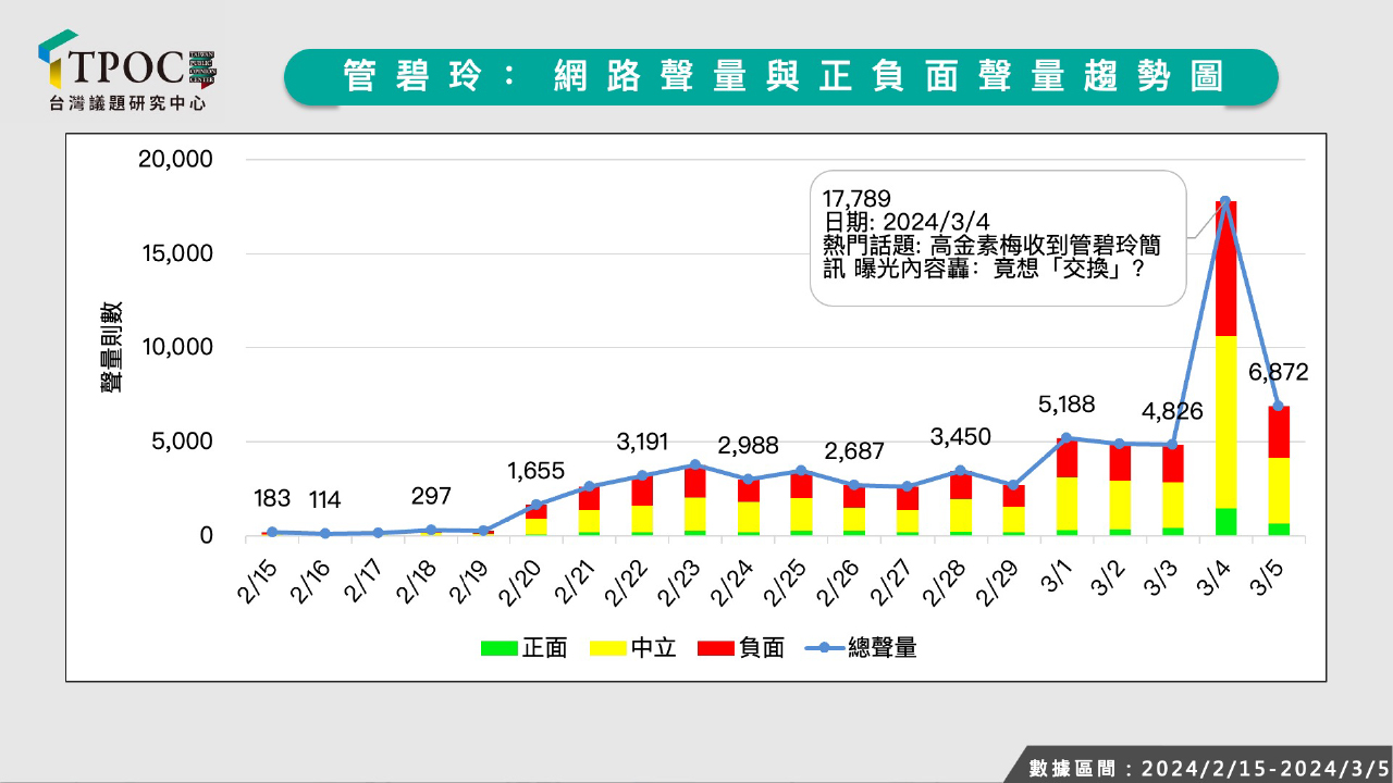 值得注意的是,網路數據調查結果也發現,自金門快艇案爭議爆發後,管碧玲的負面聲量居高不下,負面聲量比例持續維持在40%上下,儘管民進黨立委、親綠粉專也發文捍衛執政黨立場,但管碧玲的正面聲量比例始終未能突破1成,顯示多數民意對於風暴中心的管碧玲,抱持相當比例的負面觀感。