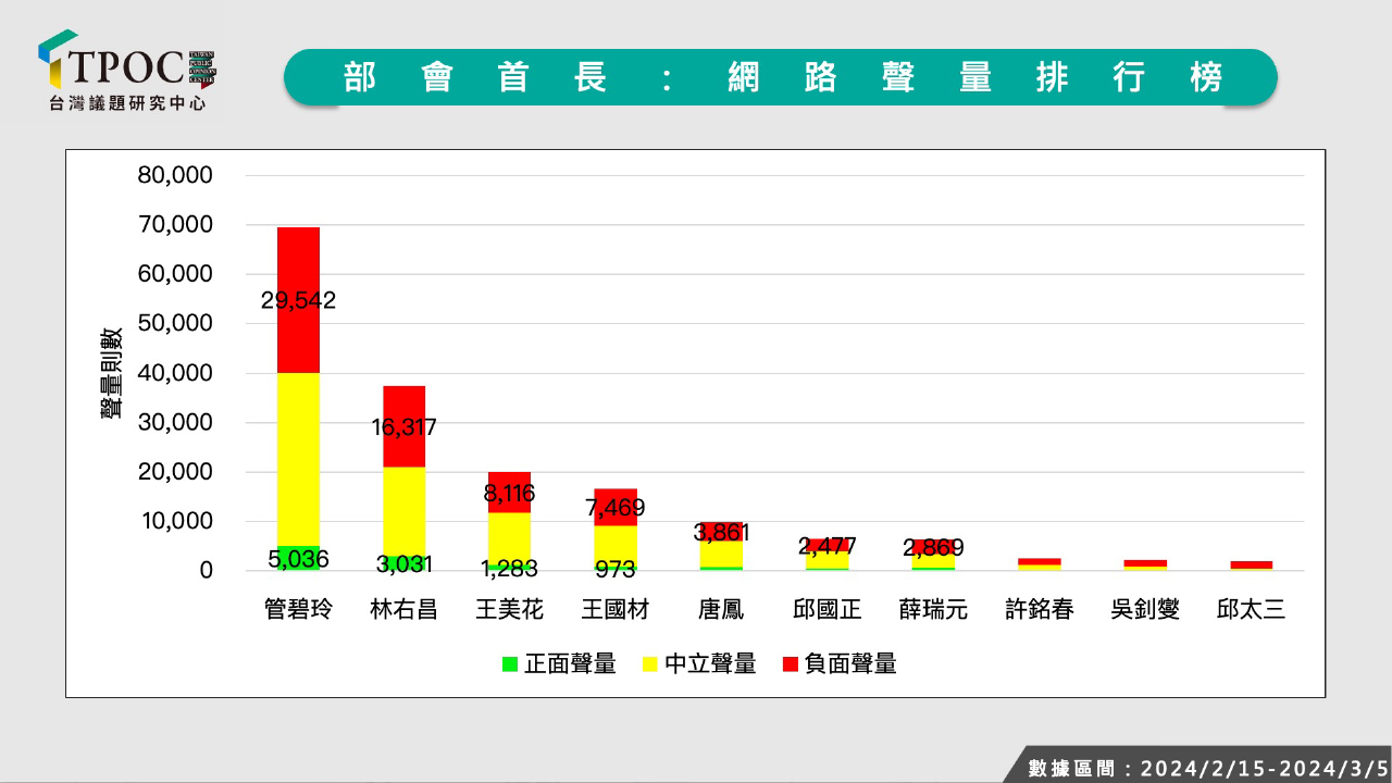 不僅如此,透過比較最近兩周民進黨政府內閣官員們的網路聲量,數據分析結果揭露,總聲量排名前10名的管碧玲(總聲量69627 則)、內政部長林右昌(37416)、經濟部長王美花(19949) 、交通部長王國材(16674)、數位發展部長唐鳳(9863)、國防部長邱國正(6483)、衛福部長薛瑞元(6307)、勞動部長許銘春(2500)、外交部長吳釗燮(2230)、陸委會主委邱太三(1984),管碧玲由於爭議纏身,聲量「狠甩」所有部會首長,且管的負面聲量也「爆棚」,1人的負面聲量就佔據前10人負面聲量總和的4成,負聲量逼近3萬則,可說是目前「仇恨值最高」的部會首長。