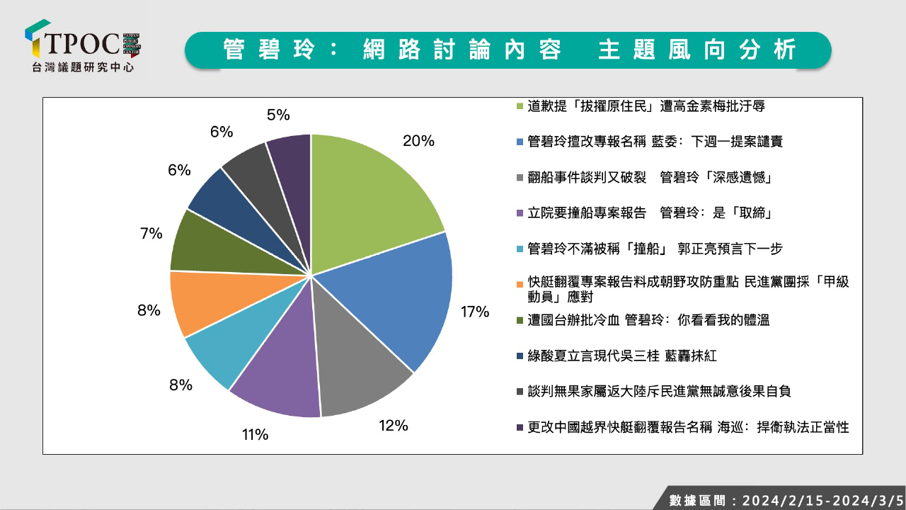 最後,透過網路主題風向分析發現,網路上有關管碧玲的討論文章中,管碧玲道歉提「拔擢原住民」遭高金素梅批評污辱一事聲量佔比最高,佔比高達20%,是所有話題中最受矚目的;第二名則是「管碧玲擅改專報名稱,藍委預告將提案譴責」的討論,聲量佔比達17%;第三名是翻船事件談判破裂,管碧玲表示「深感遺憾」,佔比12%;第四名是「立法院內政委員會將專案報告命名為『撞船』,但管碧玲不認同,認為是『取締』」,相關討論佔比11%;第五名是「管碧玲不滿被稱『撞船』,前立委郭正亮預言下一步是選高雄市長」的討論,佔比8%。