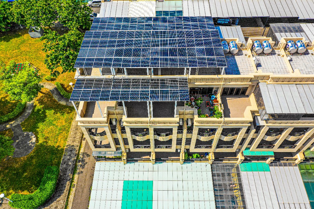 ↑圖說:太陽光電屋頂的設置可達到良好隔熱效果降低室內溫度(圖片來源:高雄市工務局提供)