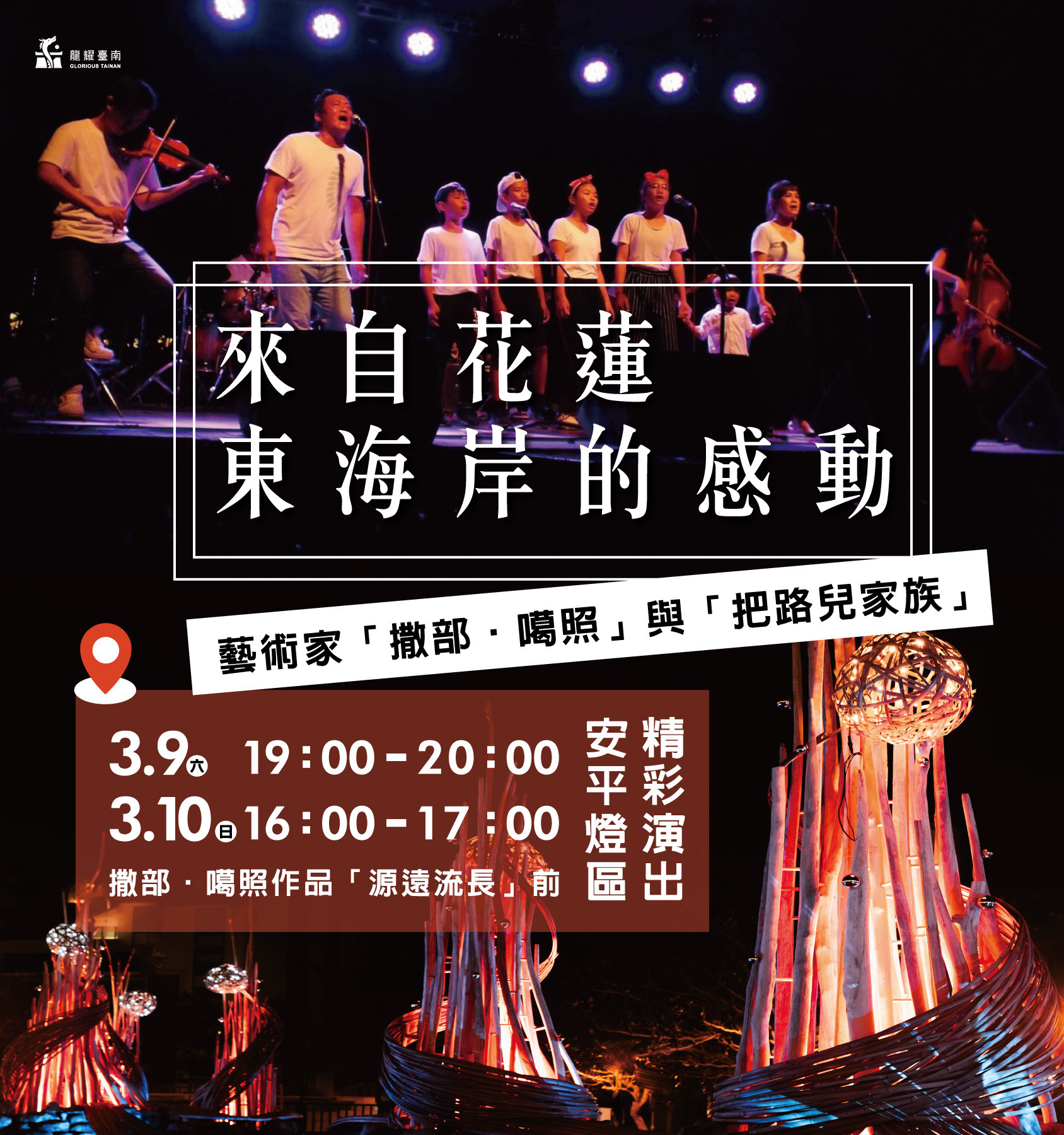 台南市府表示,自即日起,安平燈區每日都有來自全國各地,超過十組以上表演團隊現場演出包含週六(9)由阿雞 X 曾伯豪 DJ小衛開場,並由虎劇團x龍門藝術帶來精彩的馬戲特技秀;週日(3/10)由王功兩廣國術龍獅戰鼓團滂薄開場到客家鐵肺姐妹花「霓好樂團」震撼壓軸。此外,市府特別力邀「把路兒家族」的隱藏版演出,由安平燈區的創作藝術家撒部‧噶照,帶著家族從東海岸來到西海岸,與現場觀眾和居民分享他們對土地、海洋的真摯情感。,