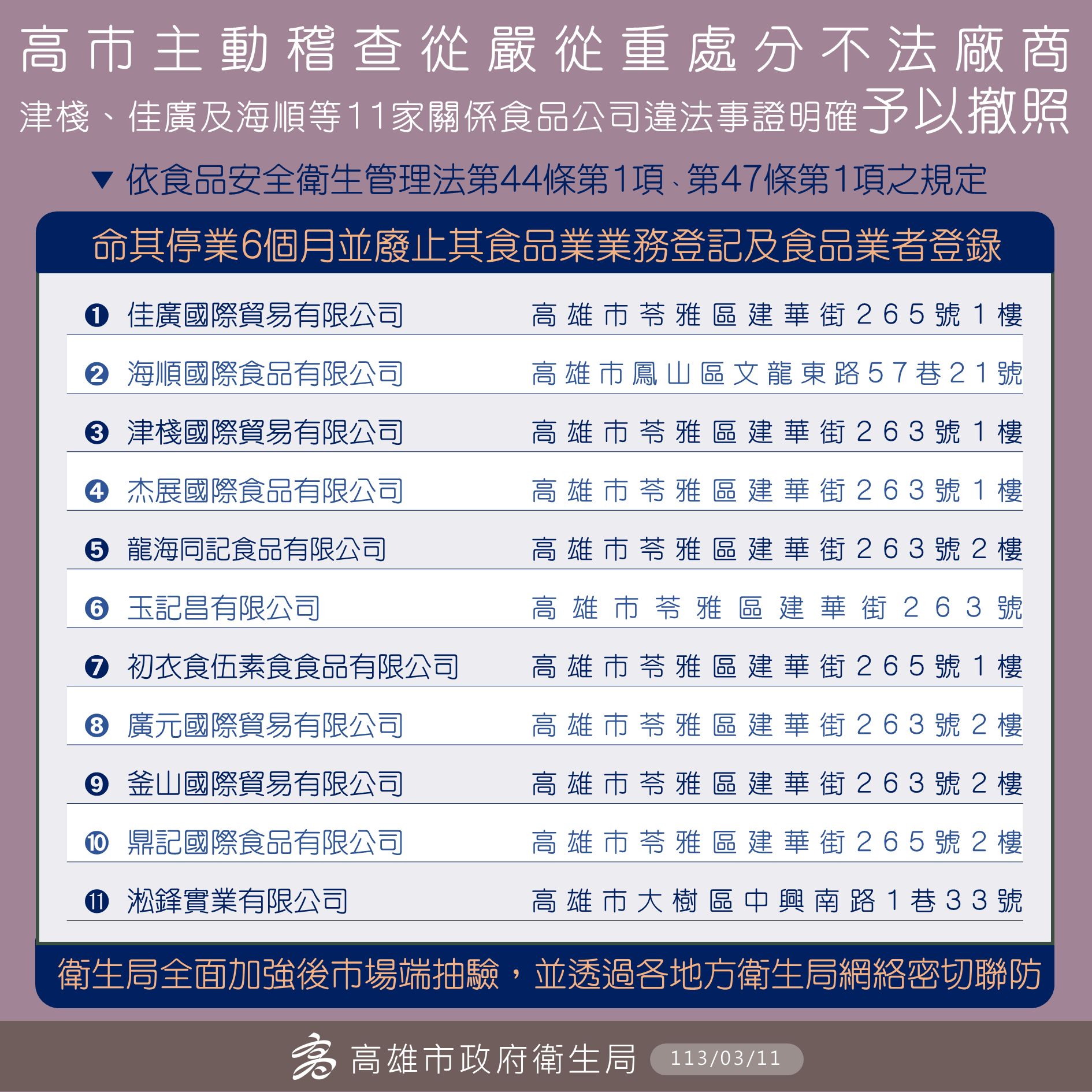 高市主動稽查,加速從嚴從重處分不法廠商,今(11日)將津棧、佳廣及海順等11家違法關係食品公司予以撤照,衛生局將全面加強後市場端抽驗,並透過各地方衛生局網絡密切聯防,