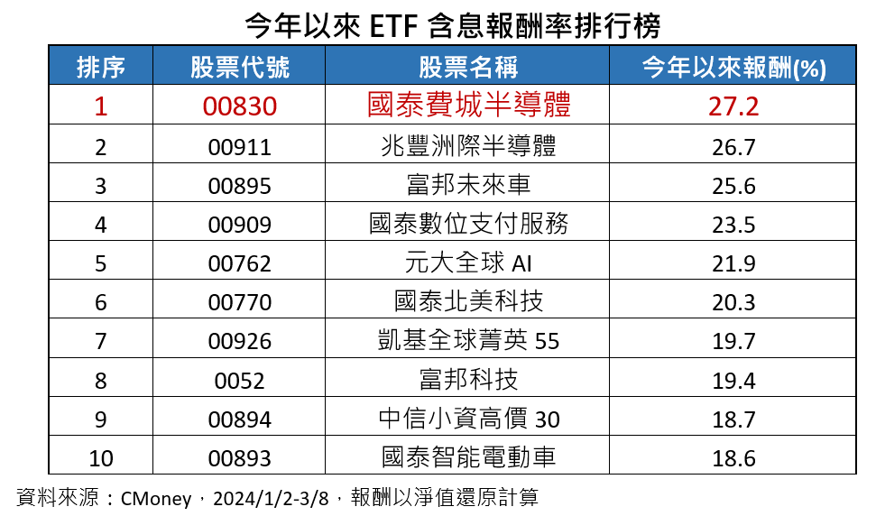 台股今年屢次改寫歷史新高,上週一度突破2萬點,創下歷史新高20065點,另一頭,不少ETF也有亮眼表現,像是國泰費城半導體(00830)今年以來截至上週五(3月8日),含息報酬超過27%,兆豐洲際半導體(00911)報酬率也高達26.7%。