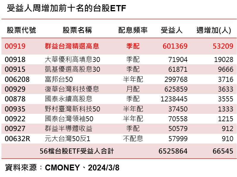 回頭看台股ETF,市場依舊強強滾,受益人上周增加6萬6545,總受益人從去年底的607萬628人,已經來到652萬5864人,續創歷史新高。進一步觀察單檔表現,最新一周共有25檔受益人增加,其中,群益台灣精選高息ETF(00919)增加5.3萬人,人氣最旺,其他像是00918、00915、006208、00929、00878、00935、00922、00927、00632R,也都名列榜上。