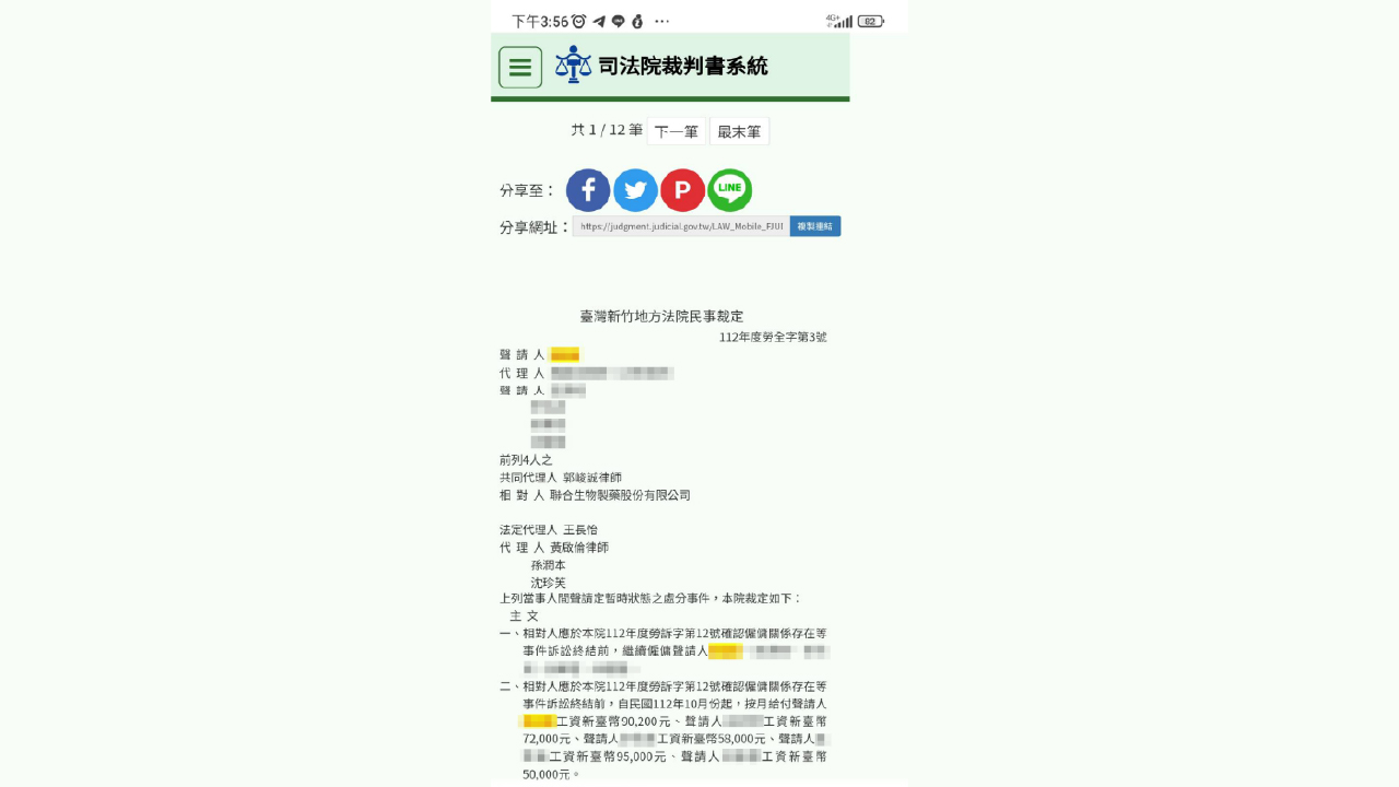 ↑圖說:法院裁定聯生藥在確認僱傭關係訴訟終結前,必須給付員工薪資,聯生藥不但不付,還要求續聘員工必須簽署離譜協議書才能上班。(圖片來源:司法院官網)