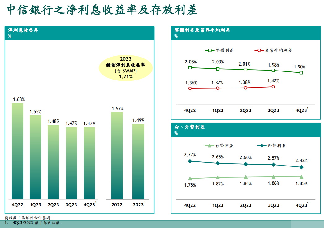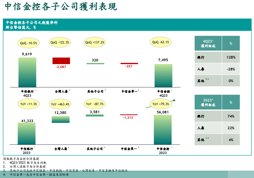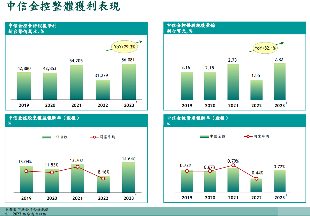 中信金自結2023年稅前盈餘669.34億元,稅後盈餘560.81億元,年成長79%,創歷史新高;稅後股東權益報酬率(ROE)14.64%,是同業之冠;稅後資產報酬率(ROA)0.72%,每股稅後盈餘(EPS)為2.82元。