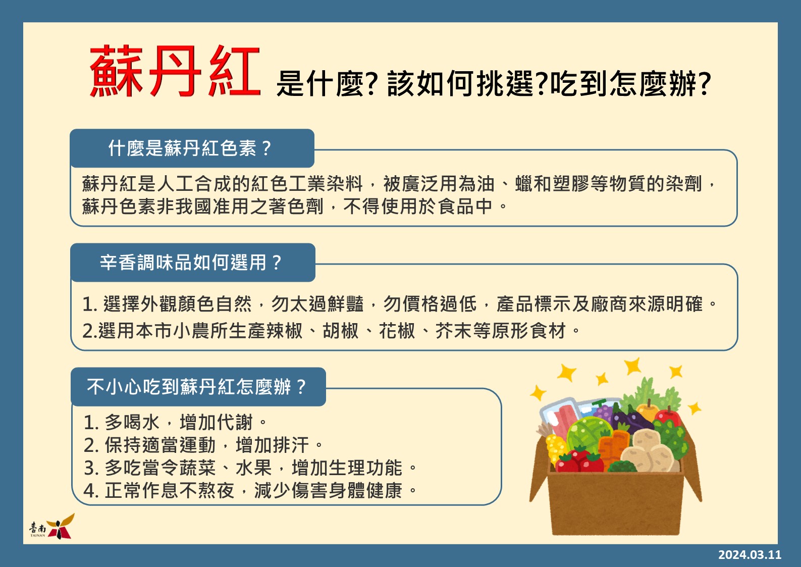 為因應蘇丹紅色素食品於市場上擴散,台南市衛生局於衛生局網站上建置「蘇丹色素食安專區」,並公布南市稽查批號及流向、南市抽驗產品之檢驗結果及食藥署公告蘇丹色素不合格名單等資訊,以供市民選購產品參考。