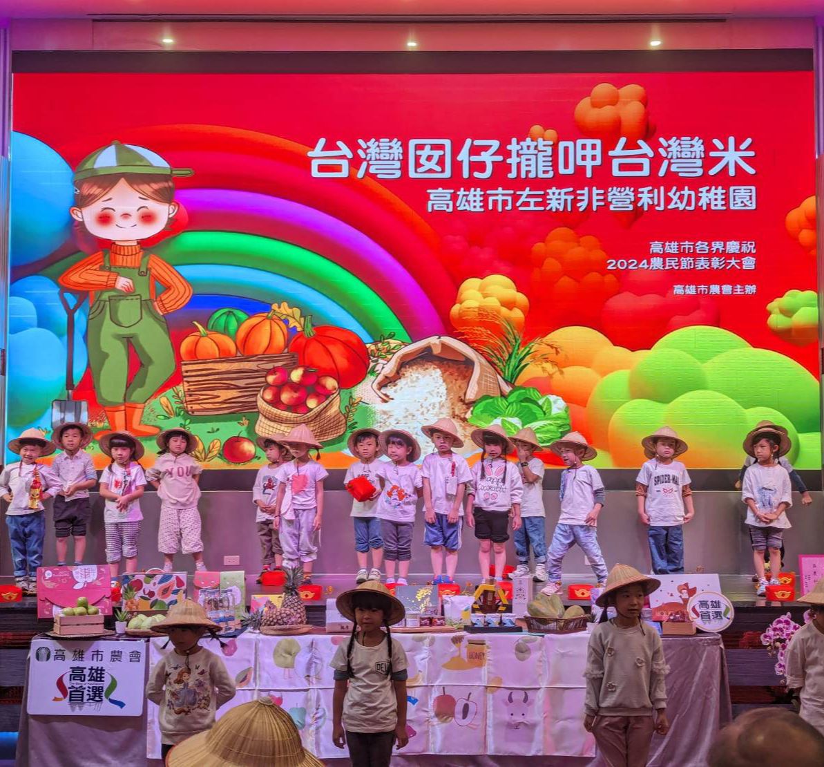 農民節表彰大會表揚201位各農業領域優秀農民,包括專業農民、農家婦女、青年農民、新住民(女力) 、原住民及推廣農業有特殊成就人員等,還邀請快樂林舞蹈社及高雄左新非營利幼兒園表演,其中幼兒園小朋友以自製的農民服裝道具,唱跳演出「台灣囝仔攏吃台灣米」,活潑逗趣的模樣,為大會增添活潑愉悅的氣氛。