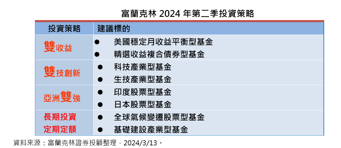 富蘭克林證券投顧表示,面臨AI創新驅動經濟及美歐央行將轉為寬鬆的投資環境,看好全球股債市第二季投資前景,但隨著股市屢創新高後震盪加大,債券殖利率隨著降息預期上下起伏,增添操作難度,建議投資人採取「好市成雙、三路並進」策略,掌握第二季行情。