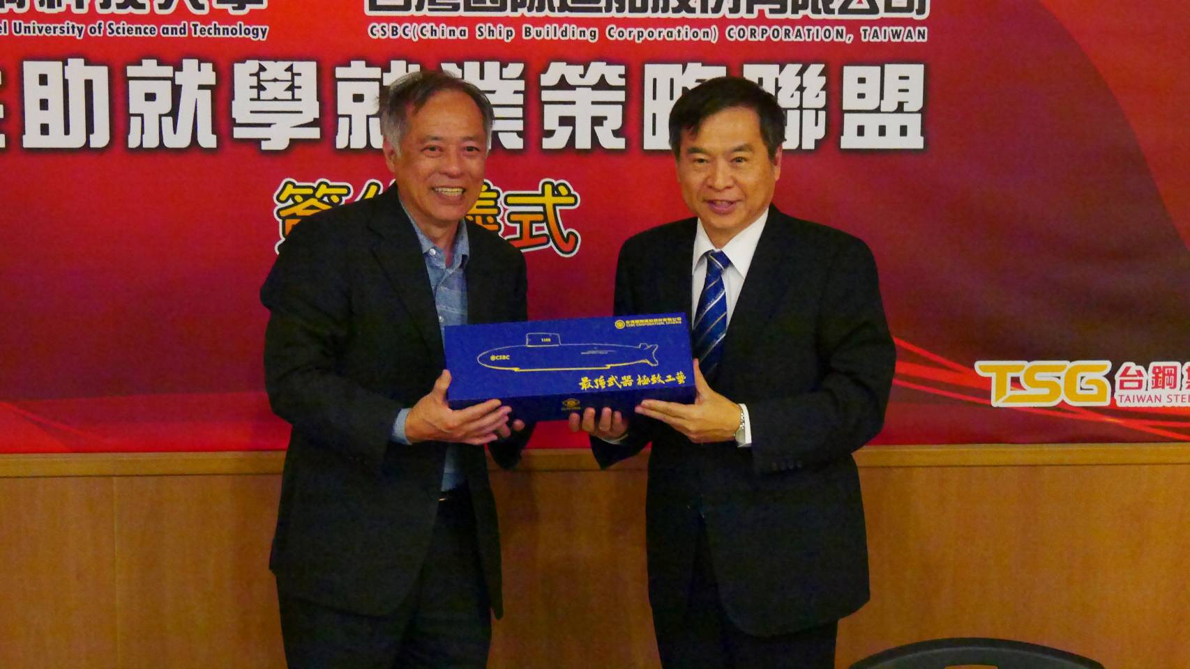 ↑圖說:台船董事長鄭文隆(右)與台鋼科大董事長林輝政互贈紀念品。(圖片來源:台鋼科大提供)