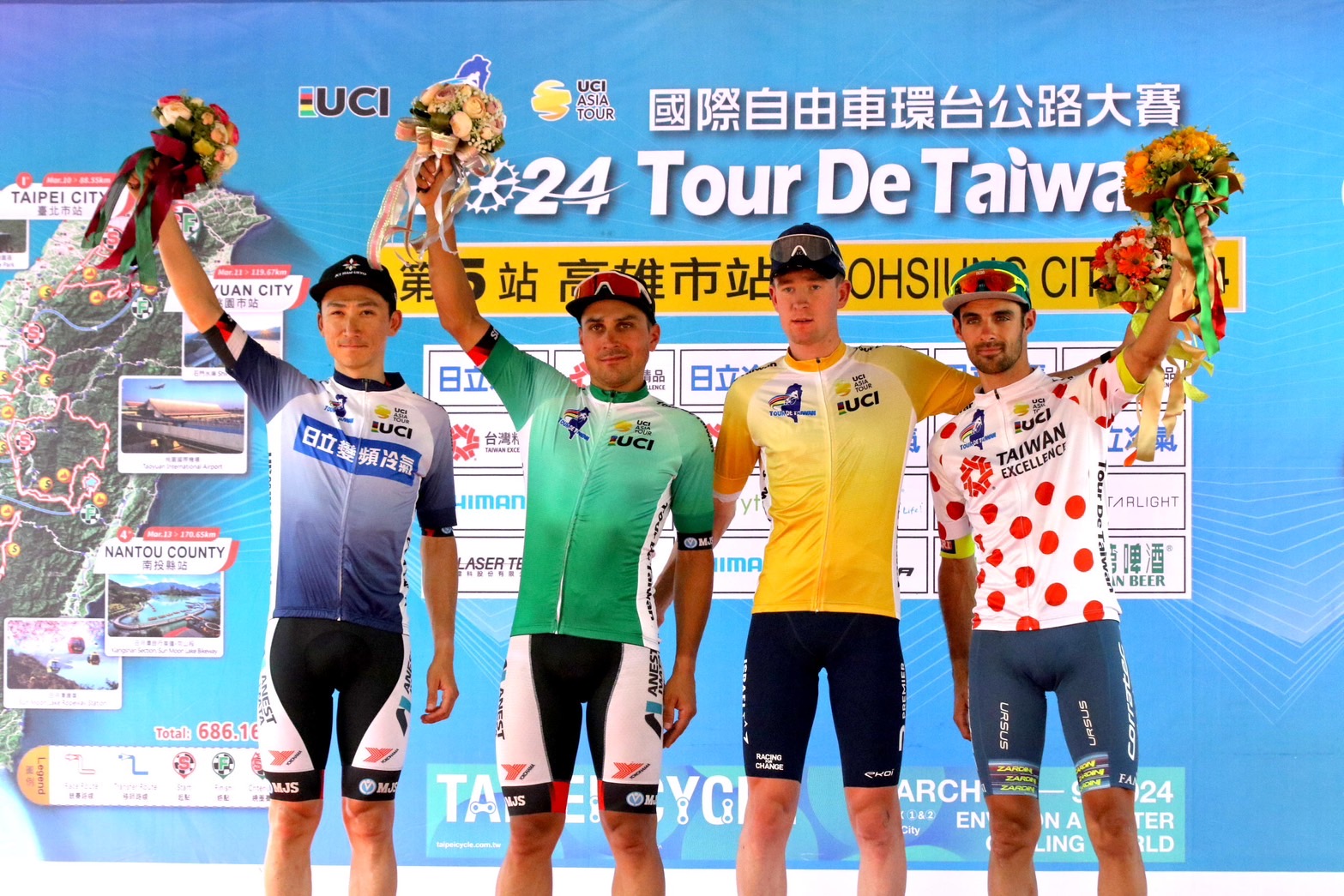 ↑圖說:環台賽得獎選手,左起亞洲冠軍-藍衫 日本右京隊KOISHI Yuma小石祐馬、衝刺王-綠衫 日本右京隊 MALUCELLI Matteo梅西、個人總冠軍-黃衫 以色列職業隊 BLACKMORE Peter Joseph布萊克摩爾、登山王-紅點衫 義大利科勒泰隊 DEBONS Antoine德邦斯。(圖片來源:高雄市運動發展局提供)