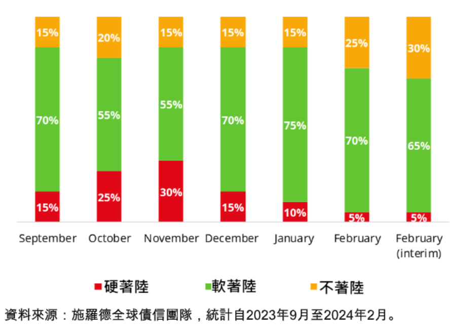 施羅德投資團隊表示,去年底展望2024年時,許多投資機構皆認為未來12個月經濟狀況仍以「軟著陸」發生機率最高,也就是就業市場穩定、通膨下滑,美國聯準會及各大央行會如期降息,結束緊縮政策。今年第一季已來到尾聲,隨金融環境逐漸寬鬆,「硬著陸」機率發生機率明顯降低,而持續優於預期的經濟數據則指向未來經濟「不著陸」的機率小幅增加。