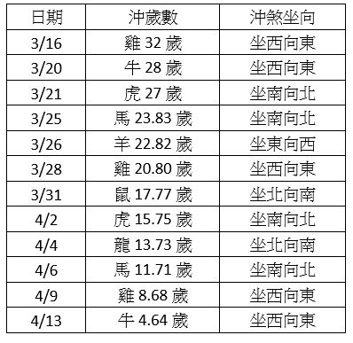 3月16日,沖屬雞32歲,坐東向西不宜。3月20日,沖屬牛28歲,坐西向東不宜。3月21日,沖屬虎27歲,坐南向北不宜。3月25日,沖屬馬23.83歲,坐南向北不宜。3月26日,沖屬羊22.82歲,坐東向西不宜。3月28日,沖屬雞20.80歲,坐西向東不宜。3月31日,沖屬鼠17.77歲,坐北向南不宜。4月2日,沖屬虎15.75歲,坐南向北不宜。4月4日,沖屬龍13.73歲,坐北向南不宜。4月6日,沖屬馬11.71歲,坐南向北不宜。4月9日,沖屬雞8.68歲,坐西向東不宜。4月13日,沖屬牛4.64歲,坐西向東不宜。