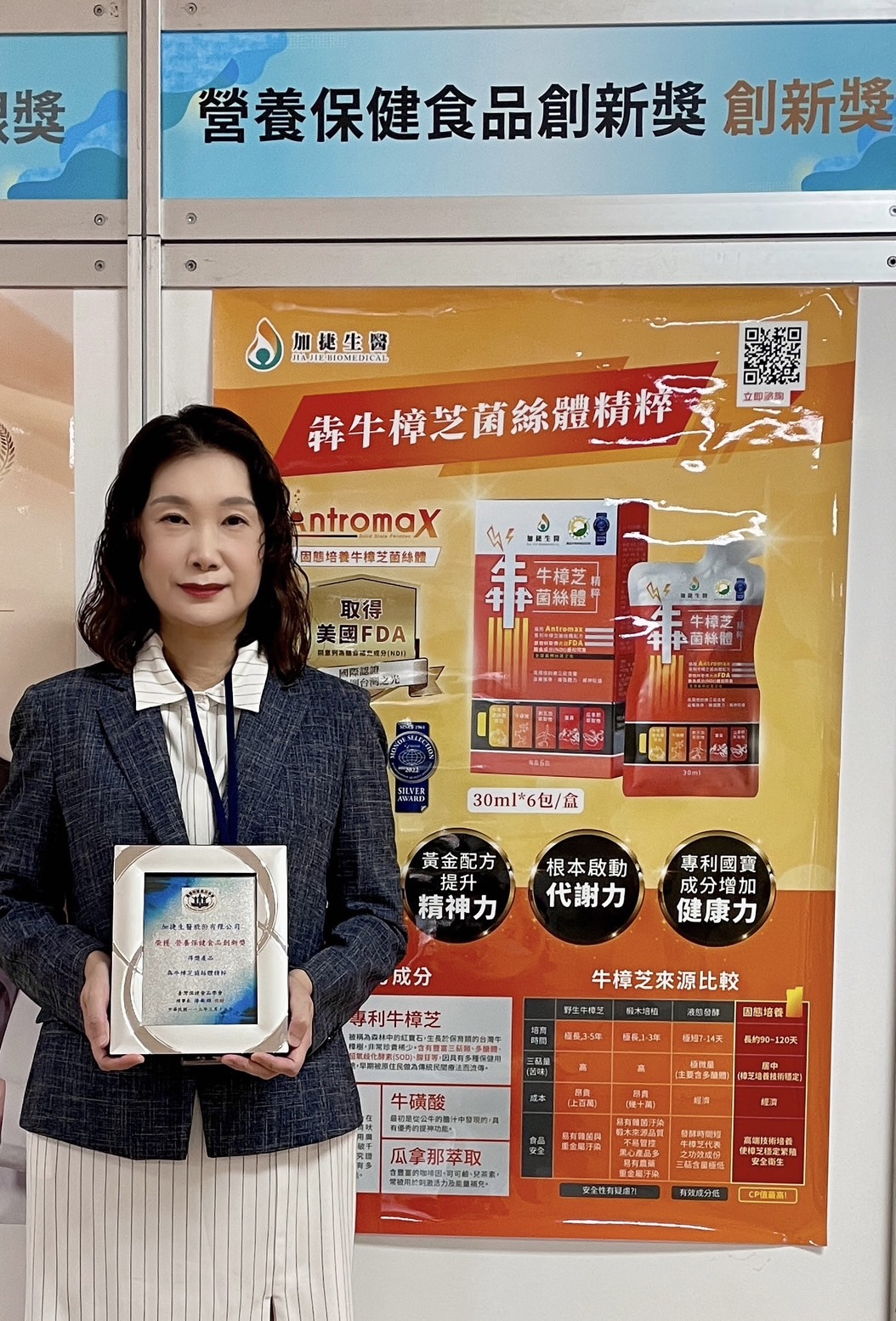 ↑圖說:加捷生醫榮獲營養保健食品創新獎,由總經理曾茗絹代表領獎。(圖片來源/加捷生醫提供)