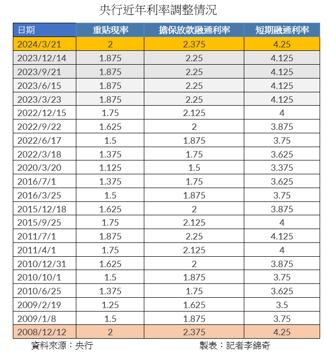 中央銀行今天舉行理監事會議,會後宣布利率調升半碼(0.125個百分點),重貼現率、擔保放款融通利率及短期融通利率,拉高至2%、2.375%及4.25%,是連續3次凍漲後,首次升息,出乎市場意料,利率水準也來到2008年12月以來的新高。
