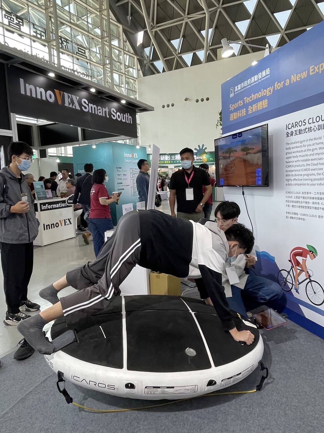 展區中,運發局安排了3D AI體態檢測,讓民眾在短短三分鐘內,檢測骨骼狀態及肌肉張力狀態,精準提供個人體態健康資訊,還能針對檢測結果提供運動建議以及相對應的伸展操作教學影片,提供體態分析、運動建議一條龍服務。另外也準備了「ICAROS CLOUD全身互動式核心訓練器」,透過超過30種互動遊戲,讓民眾可以在安全且有趣的情境下訓練核心肌群。