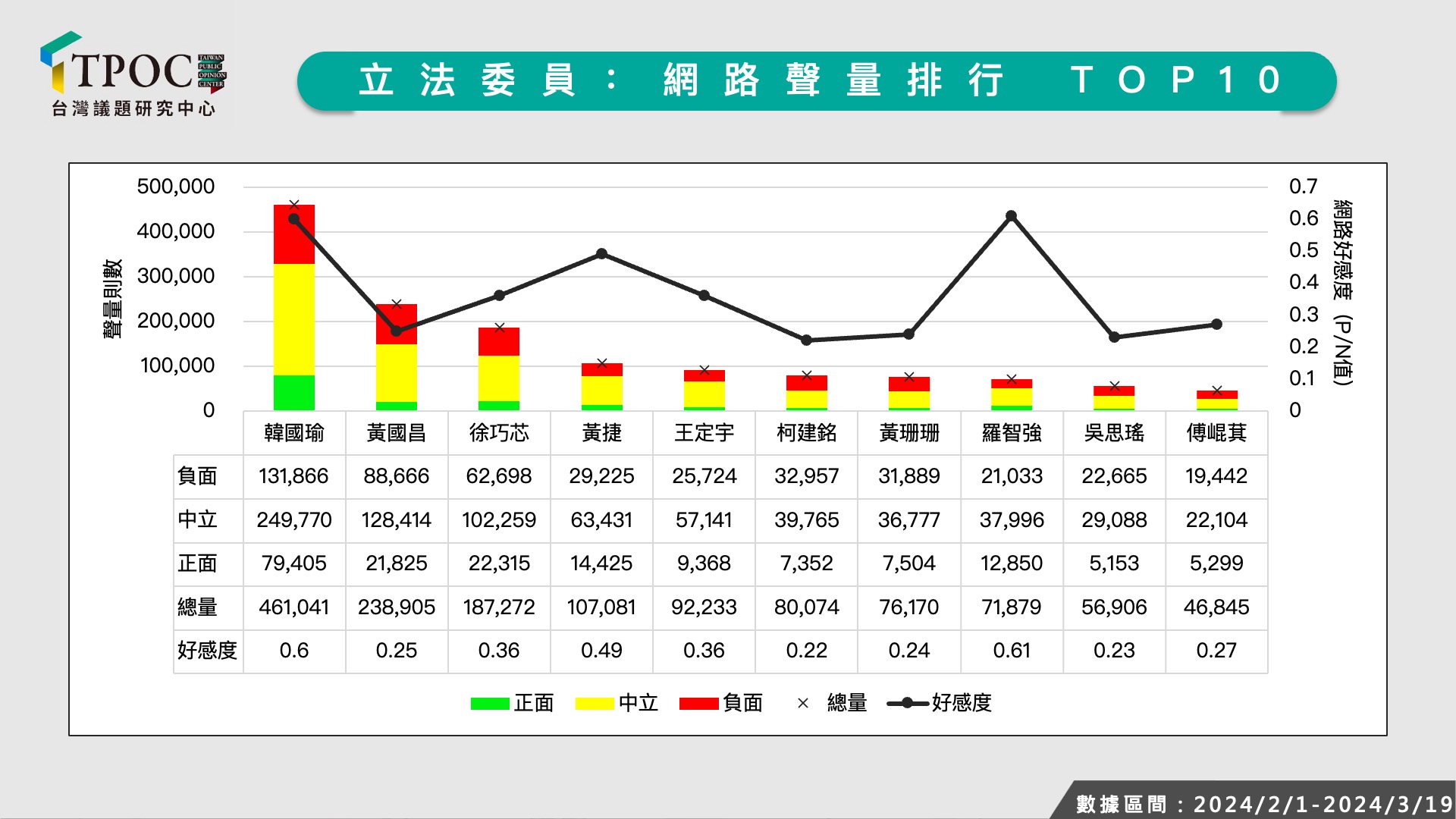 昔日曾為時代力量立委的黃國昌,今年改披「白袍」,以民眾黨不分區立委身份重回國會。黃國昌擔任民眾黨團總召職務,與黃珊珊兩人被戲稱為黨內「雙黃」,在媒體版面搶盡鋒頭,一言一行都受到矚目,調查期間內獲得超過23.8萬則總聲量,好感度僅0.25,意味著負面聲量遠超正面聲量。回顧新國會1個多月以來,黃國昌除了緊抓時事議題,也頗有自行開創「戰場」的能力,例如追打詐騙、偵查不公開、台鹽綠能大虧損等議題,均在線上掀起一波討論,然而在太陽花學運10周年前後,他也因為今昔言論不同調,飽受網友們批評。