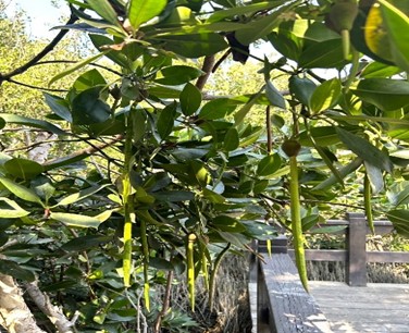 ↑圖說:紅海欖樹上結實累累的胎生苗,直到發育成熟後才會脫離母樹。(圖片來源:高雄市工務局提供)
