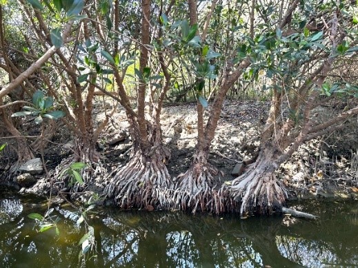 ↑圖說:基部膨大的板根讓水筆仔能在濕地站穩腳步,並具有防潮、固土等功能。(圖片來源:高雄市工務局提供)