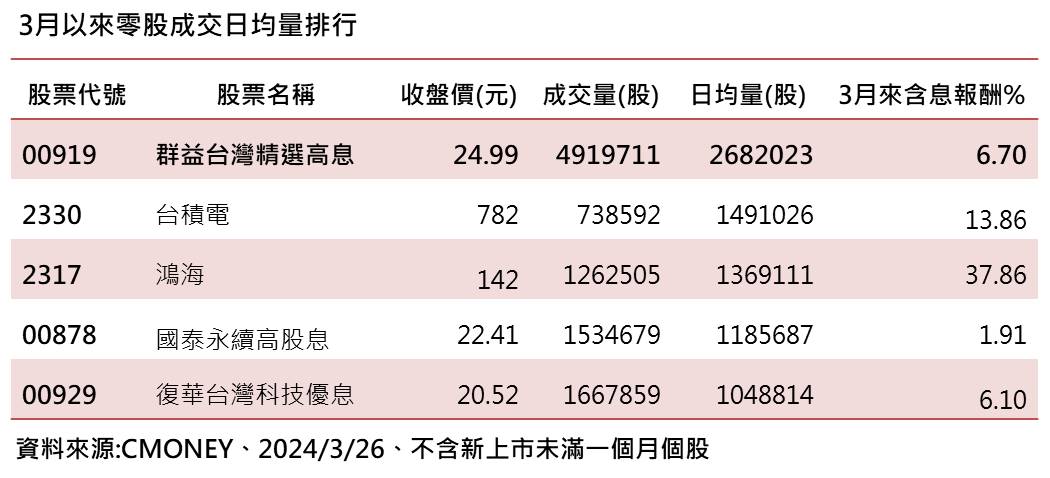 台股高檔震盪,但小資族仍持續前進零股市場,法人統計3月以來台股零股交易情況,其中,群益台灣精選高息ETF(00919)交易日均量268萬股,最具人氣,其次是台積電的149萬股、鴻海的136萬股。