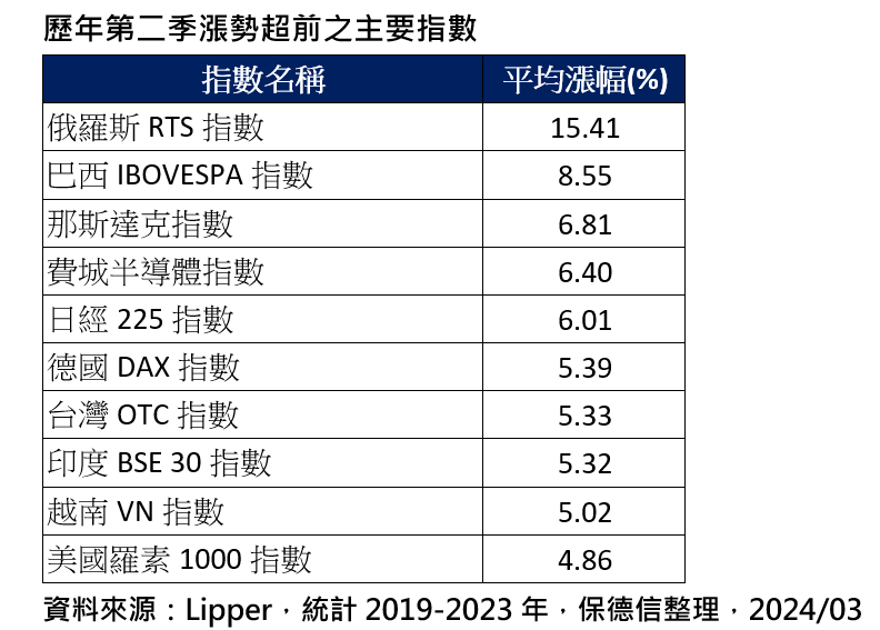 第二季即將到來,保德信統計近五年來全球主要指數在第二季的表現,仍有不少市場能繳出相對優異的報酬率,且撇除波動較大、與資源高度連動的市場後,包括美國、日本、德國、台股皆榜上有名,Q2平均漲幅可達5%以上,其中,與台股高度連動的那斯達克與費城半導體指數,歷年第二季漲勢皆超過6%。
