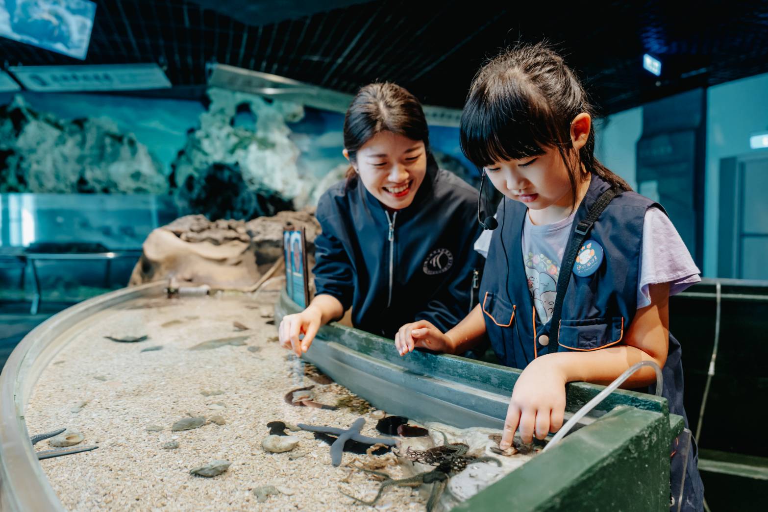 萌版「迷你解說員親子營」活動,由專業解說員為孩子們量身訂製的小小職人培訓課程,除了認識潮間帶生物與可愛的企鵝之外,更重要的是揹上象徵知識傳遞的麥克風,站上成果發表舞台展示海洋知識,入夜後由導覽員帶領探索神秘且幽暗的海洋,與魚兒共枕眠。