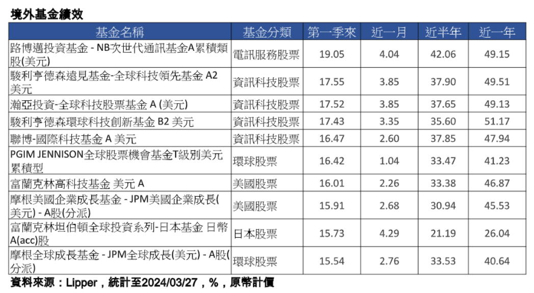 第一季境外基金強者出列!根據統計,第一季MSCI世界指數漲幅8.45%,美股S&P 500指數漲幅更是超過一成,而近千檔境外股債基金中,第一季表現前十強的基金漲勢全數超越大盤,漲幅自15.5%起跳,且基金類型也相當多元,囊括資訊科技、環球股票、美股、日股、電訊服務等5大類。