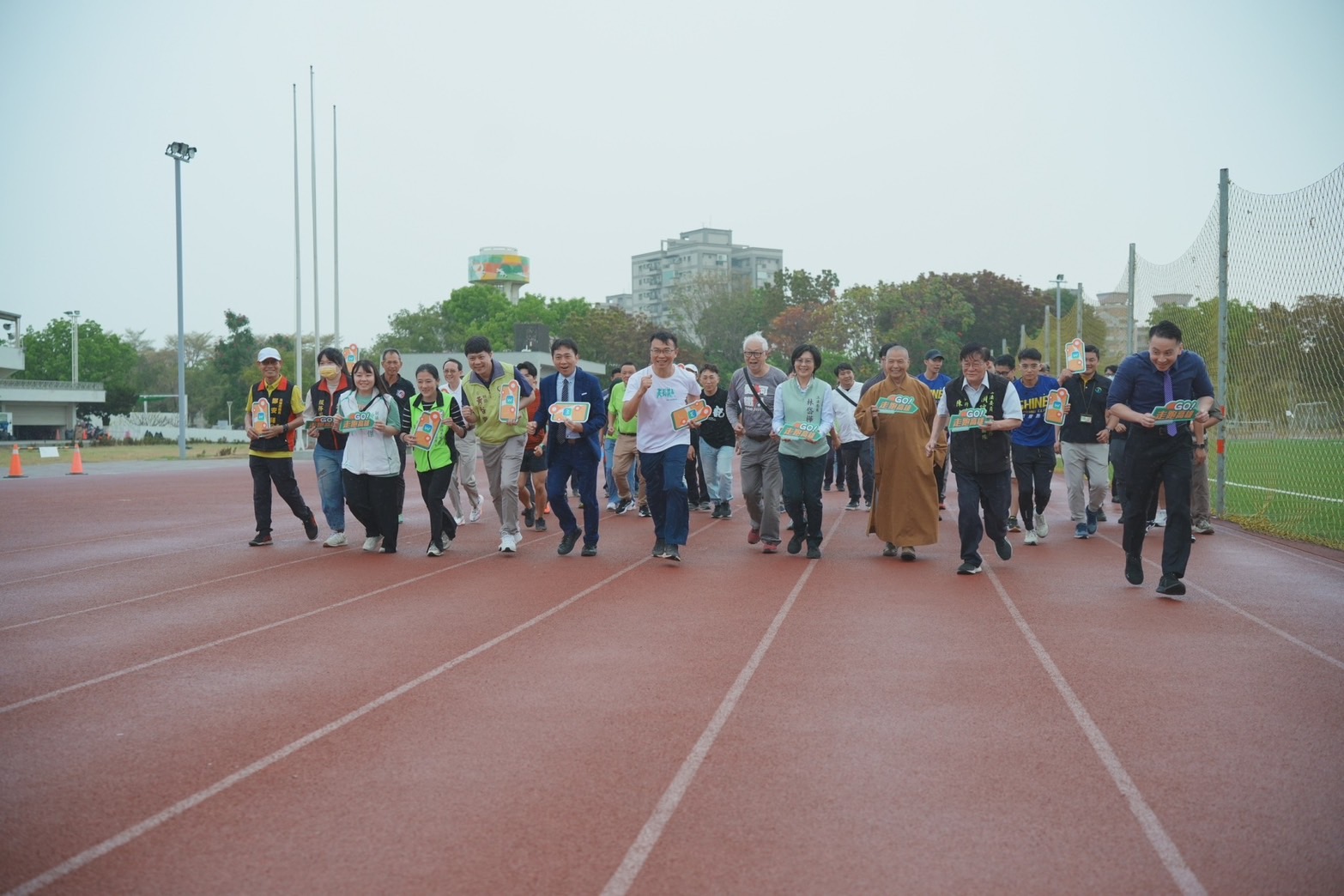 ↑圖說:侯局長與跑團、運動中心、佛光山等貴賓合影,揭開活動序幕。(圖片來源:高雄市運動發展局提供)