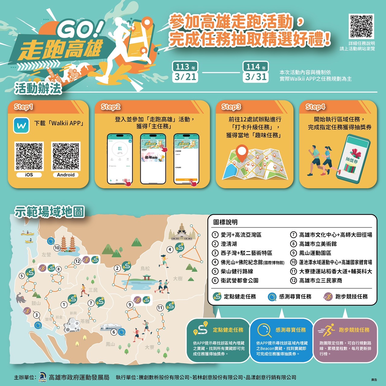 「GO!走跑高雄」活動結合在地商家、運動產業共同推廣,於活動期間內(113年3月21日起至114年3月31日止),下載「Walkii 線上運動會」APP,參加「GO!走跑高雄」任務,收集任務卡並完成指定任務,就有機會獲得合作店家相關優惠及便利超商電子商品券,此外,運發局更加碼於FB辦理兩波好禮抽獎活動,抽獎大禮有價值萬元以上的智慧跑步手錶和體脂機等多重好康,相關資訊可洽高雄市政府運動發展局KSD好運發臉書粉專(https://www.facebook.com/ksdkcg),在地店家如要一起響應活動,也可與運發局聯繫。