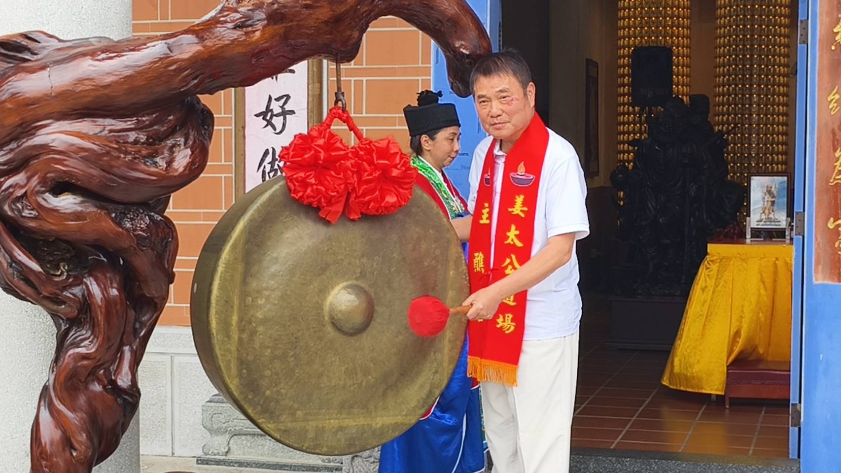 圖說:苗栗縣長鍾東錦敲鑼,宣佈客家大院桐花季起跑。