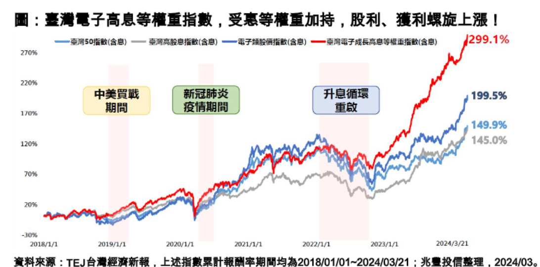 兆豐投信指出,根據臺灣指數公司統計2018年以來的累計報酬率,臺灣電子高息等權重指數之含息報酬率高達299.1%,表現大幅超越臺灣50指數、臺灣高股息指數、電子類指數的漲幅,甚至也挺過中美貿易戰、新冠肺炎疫情、重啟升息循環等多空市場考驗,展現出股利、獲利持續勁揚的投資價值。