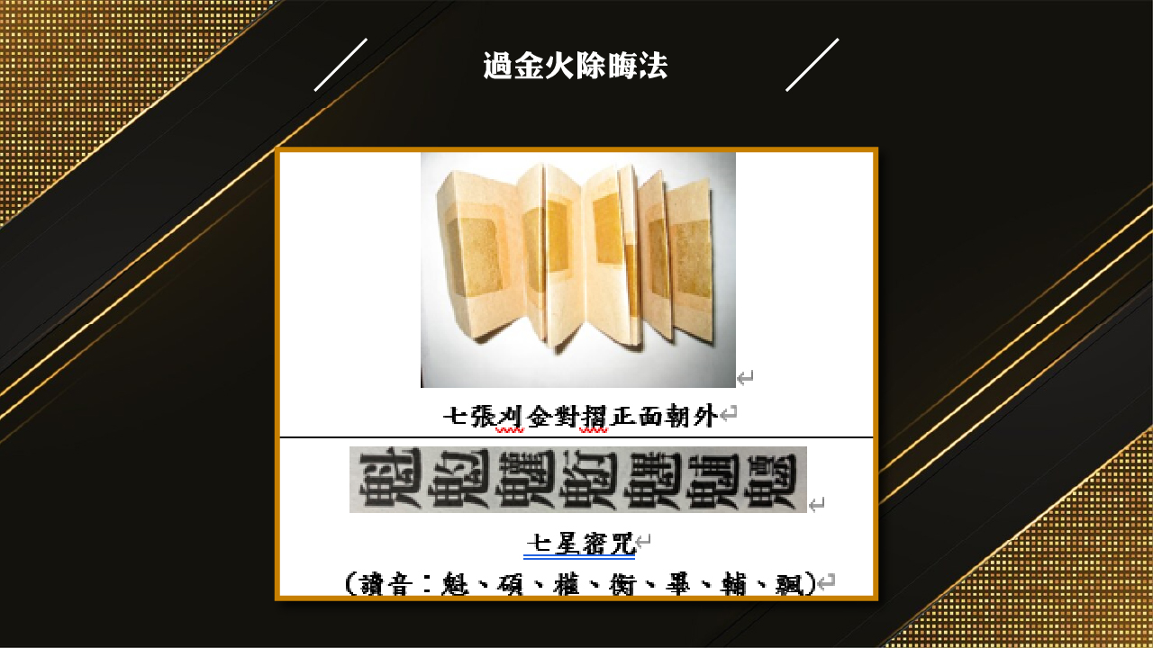 掃墓後進家大門前,在門外以七張卦金對摺(正面向外),放在外門地上,點火後,人跨越金火,口中念誦七星密咒保身 (讀音:魁、碩、權、衡、畢、輔、飄),再踏入大門進入家裡,但不可回頭。