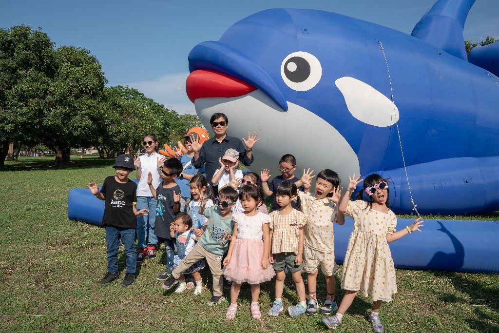 ↑圖說:多位孩子和高雄市長陳其邁一同在象徵勇氣與信心的「虎鯨」前留下合影。(圖片來源:高雄市文化局提供)
