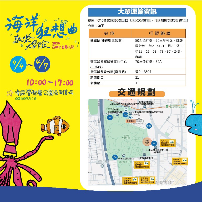 高雄市文化局表示,「海洋狂想曲 歡樂大冒險」以海洋為主題的超大型充氣裝置及戲劇體驗,活動期間天天全時段舞台表演、各式親子互動體驗、超過百攤的熱門美食及手作市集,以及以「海洋、環保、節能、高雄」為主題的闖關體驗活動區。每日早點來,更悠閒、更好玩!而紙風車深受好評的經典兒童節目「哪吒鬧龍宮」也推出高雄限定版,搭配每日開園舉辦的「龍王上班大遊行」,以及多場受觀眾喜愛的「海底世界運動會」互動演出,盼帶領孩子一同進入創新的海洋世界。活動場域周邊停車位有限,也呼籲民眾可多搭乘大眾運輸前往,享受更多歡樂親子時光。