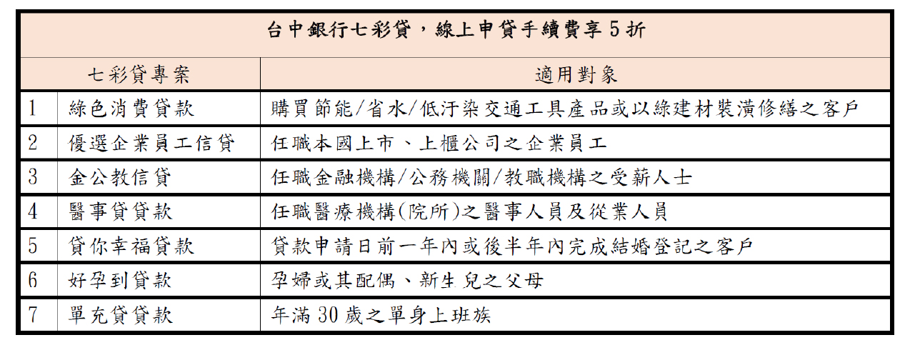 凡有資金需求且符合下表各專案適用對象的民眾,只要在2024年11月30日前,透過台中銀行官網線上申請七彩貸信貸專案,即可享有手續費5折的優惠,免出門即可線上申貸,減少親臨分行等待的時間,提升申貸效率及便利性。
