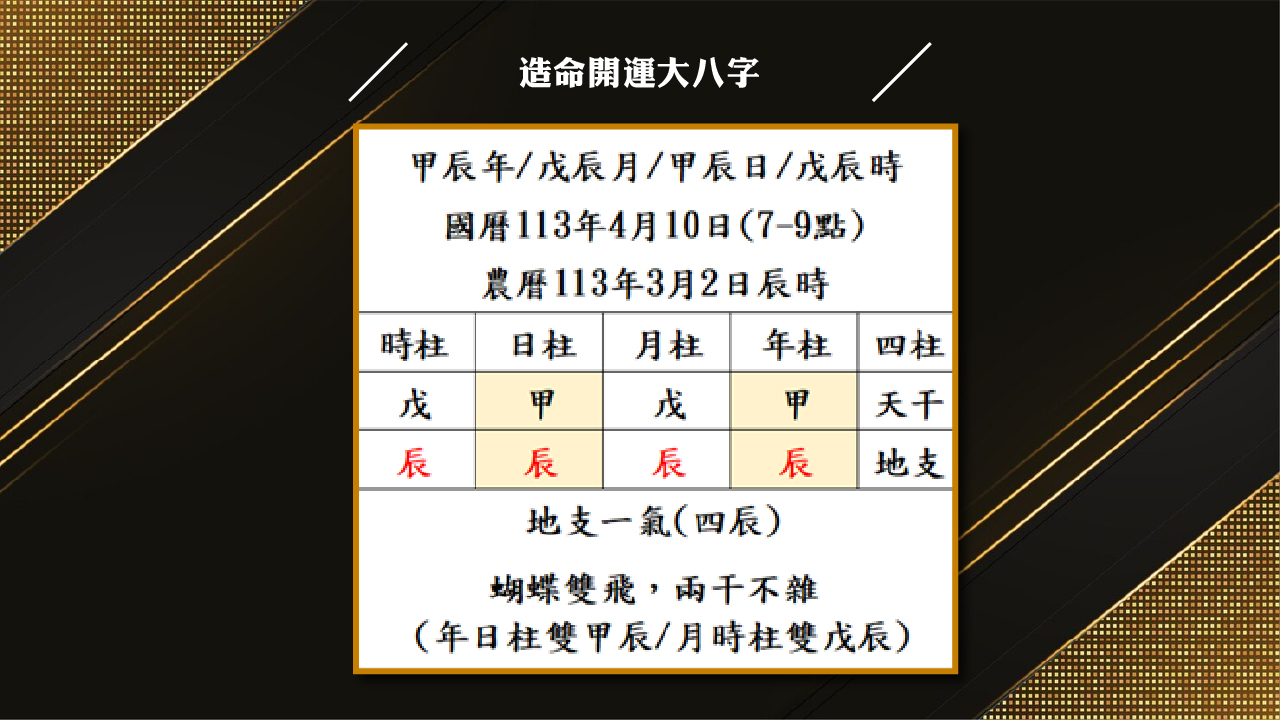 旺好運谷帥臻風水命理師指出,國曆113/4/10辰時(早上7~9點),八字為「甲辰年/戊辰月/甲辰日/戊辰時」地支四辰,為造命大八字「地支一氣」的特殊格局;年日柱雙甲辰,月時柱雙戊辰,又恰逢蝴蝶雙飛,兩干不雜之特殊格局。