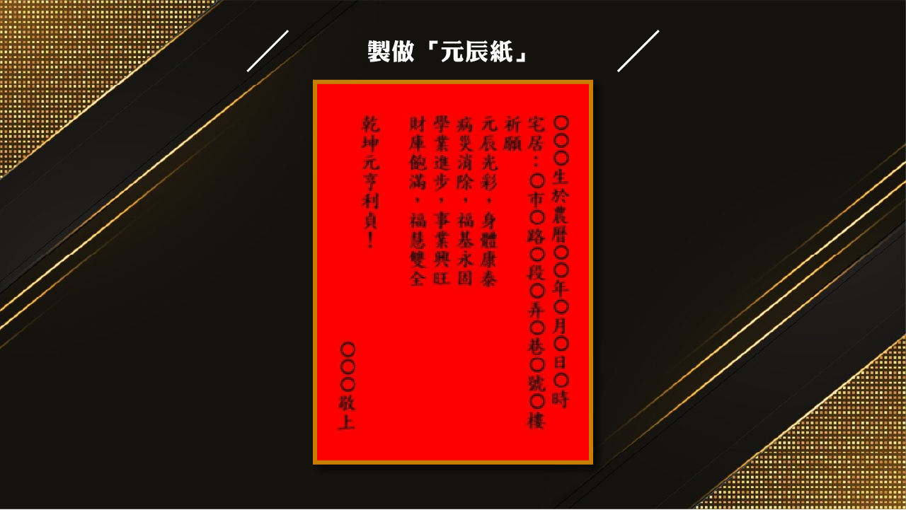 5. 製做「元辰紙」:將自己名字,出生時間,居住地址,祈求的三個願望寫在一張紅紙上。
