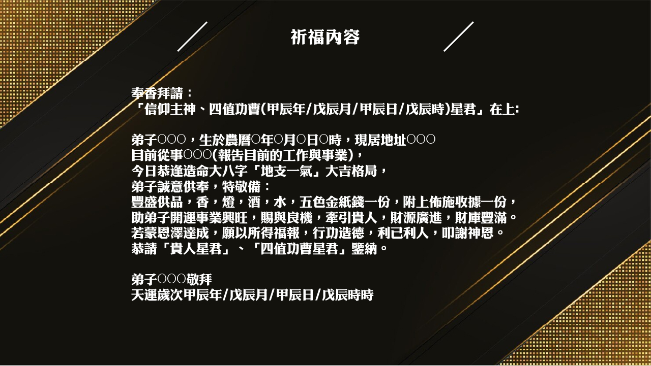 這是甲辰年春節後第一個造命開運大八字,此時祈福,對甲辰年、戊辰年生,或天干甲年、戊年之人,或生肖屬龍、雞、鼠、猴者,感應能量最強;該時日課與個人年命若形成「財」、「官」、「印」或「祿」、「馬」、「貴」者,催動財運、事業運、貴人運、效果最好。利用地支一氣、蝴蝶雙飛,這時特殊的天地磁場,間搶氣開運效果最好,可按照下列七個步驟實施祈福。