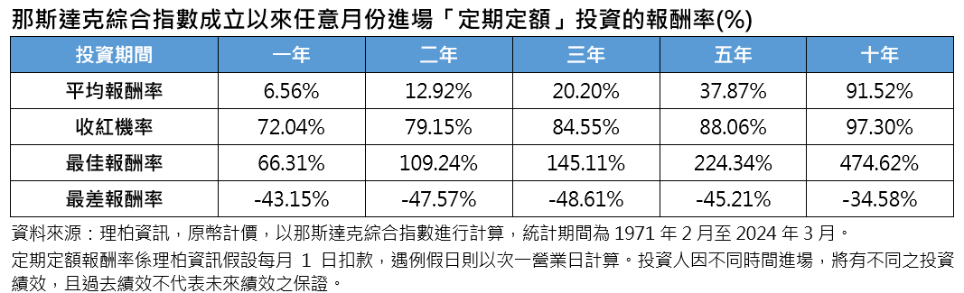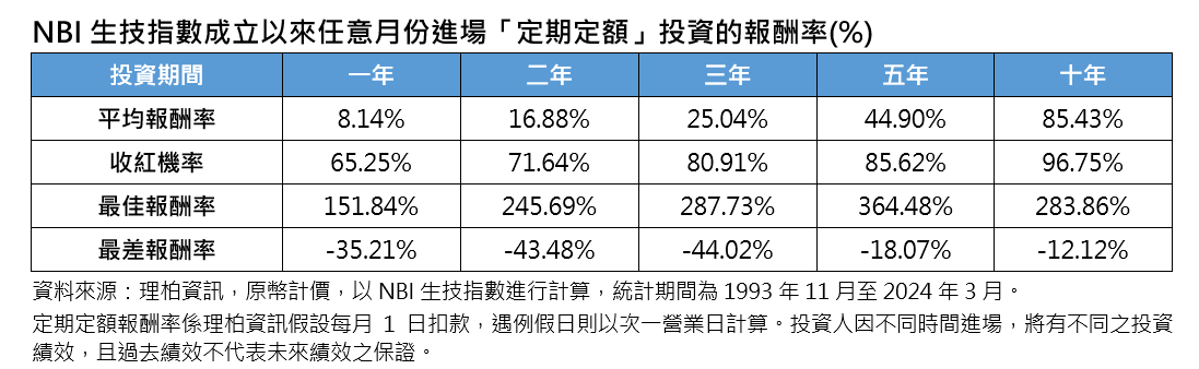 對部分投資人來說,現在買進科技股,擔心追高;買進漲勢落後的生技股,卻又擔心押錯寶。法人指出,統計1971年2月以來,任意期間定期定額投資那斯達克綜合指數三年平均漲幅20.2%,正報酬機率84.5%;若統計1993年以來,任意月份定期定額投資NBI生技指數,三年平均漲幅25.04%,正報酬機率超過八成,是參與科技股與生技股長期投資趨勢的方法之一。