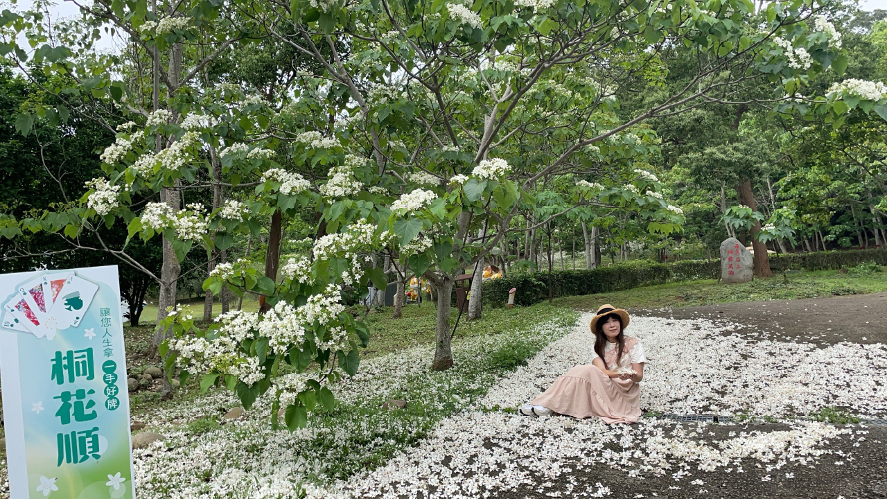 羅世新指出,客家大院位於雙峰山山腰,腹地廣大,園區佔地15公頃,栽植上萬棵油桐樹,從遠處望去,可見朵朵雪白桐花遍佈山頭,景緻壯麗。漫步在園區,白花招展,進入眼簾;若經山風吹拂,白花則如雨下,在地面形成浪漫雪白花毯,處處充滿詩情畫意。今年客家大院桐花季的亮點,莫過於近期因被神明託夢指點有靈氣,而被命名為「桐花順」的桐花樹,許多遊客都爭相與「桐花順」合影,盼如人生能拿一副好牌,事業得以順風順水。另外,位於台灣燈會兔年主燈裝置藝術旁的「台灣桐花王」,由於高達七米、樹冠約四米,傲然挺立,被視為園區珍寶,曾是攝影比賽取景的主題,擁有超高人氣,亦是園區熱門打卡景點之一。