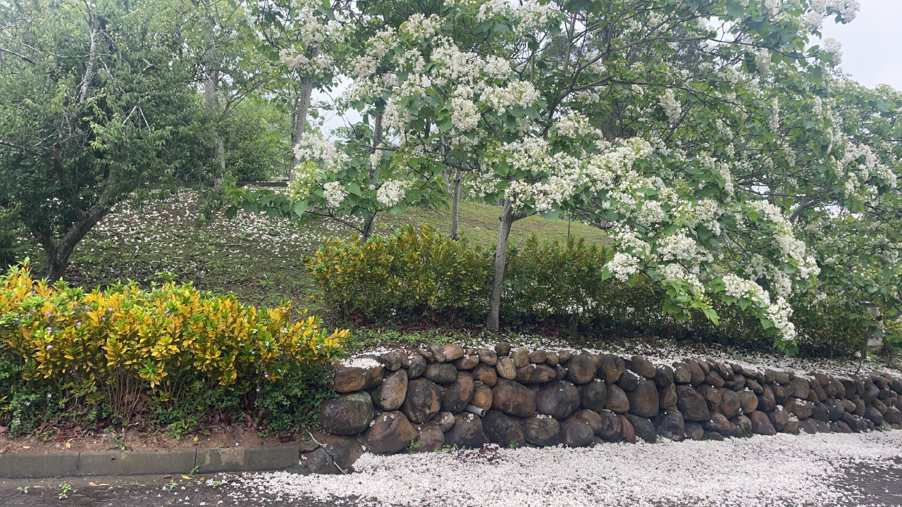 ↑圖說:客家大院栽植上萬棵油桐樹,今年花況相當好,呈現「五月雪」夢幻美景。(圖片來源:姜太公中部道場客家大院提供)