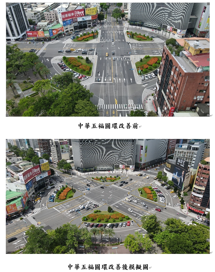 位於前金區中華三、四路與五福三路口的中華五福圓環是大立百貨商圈必經路線,過去機慢車只能繞行圓環,外環常有壅塞或擦撞情形,為提升行車順暢度,於111年10月初開放環內機慢車直行,機車騎乘方便許多。為使路口進一步簡化並改善通行動線,研議後將圓環內側現有槽化線區域轉化成人行空間,並由交通局規劃、工務局道路養護工程處施工,工程已於今年3月底進場施做。
