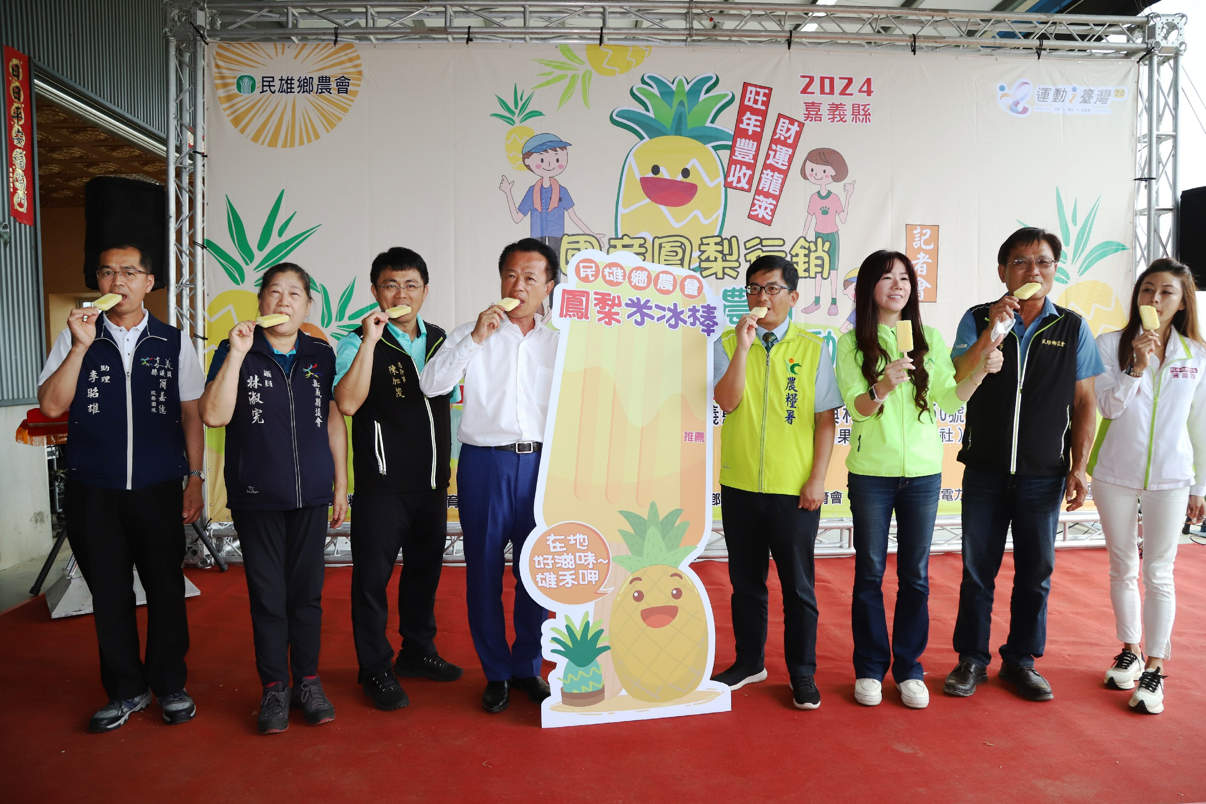 嘉義縣民雄鄉是金鑽鳳梨盛產地,清明節後正是台農17號金鑽鳳梨品質最優、口感最香甜的季節,民雄鄉農會把握鳳梨品質、口感最佳的黃金期,舉行「2024嘉義縣國產鳳梨產業行銷推廣活動」,除了宣布推出全新研發鳳梨米冰棒,也邀請民眾21日到民雄參加國產鳳梨行銷暨健走,在民雄鳳梨文化園區沿途飽覽鳳梨田園景色,還能免費品嚐鳳梨米冰棒、暢飲清涼消暑的鳳梨醋、購買鮮採鳳梨,支持在地農特產。