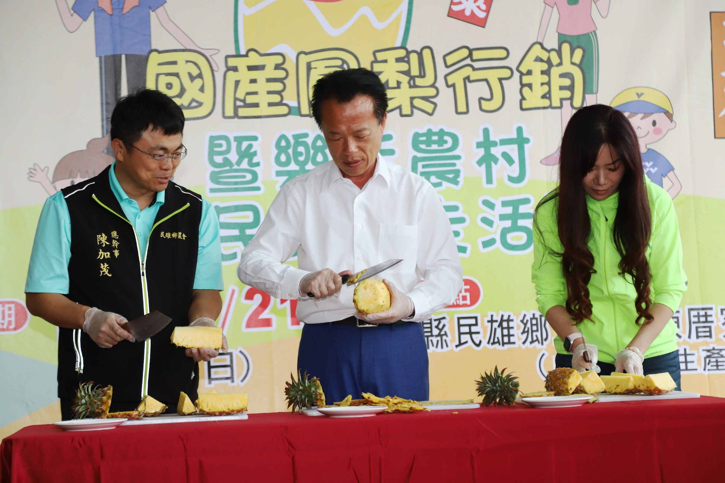 ↑圖說:嘉義縣長翁章梁(中)、嘉義縣農會總幹事黃貞瑜(右)、民雄鄉農會總幹事陳加茂(左)比手速切鳳梨(圖片來源:嘉義縣農業處提供)