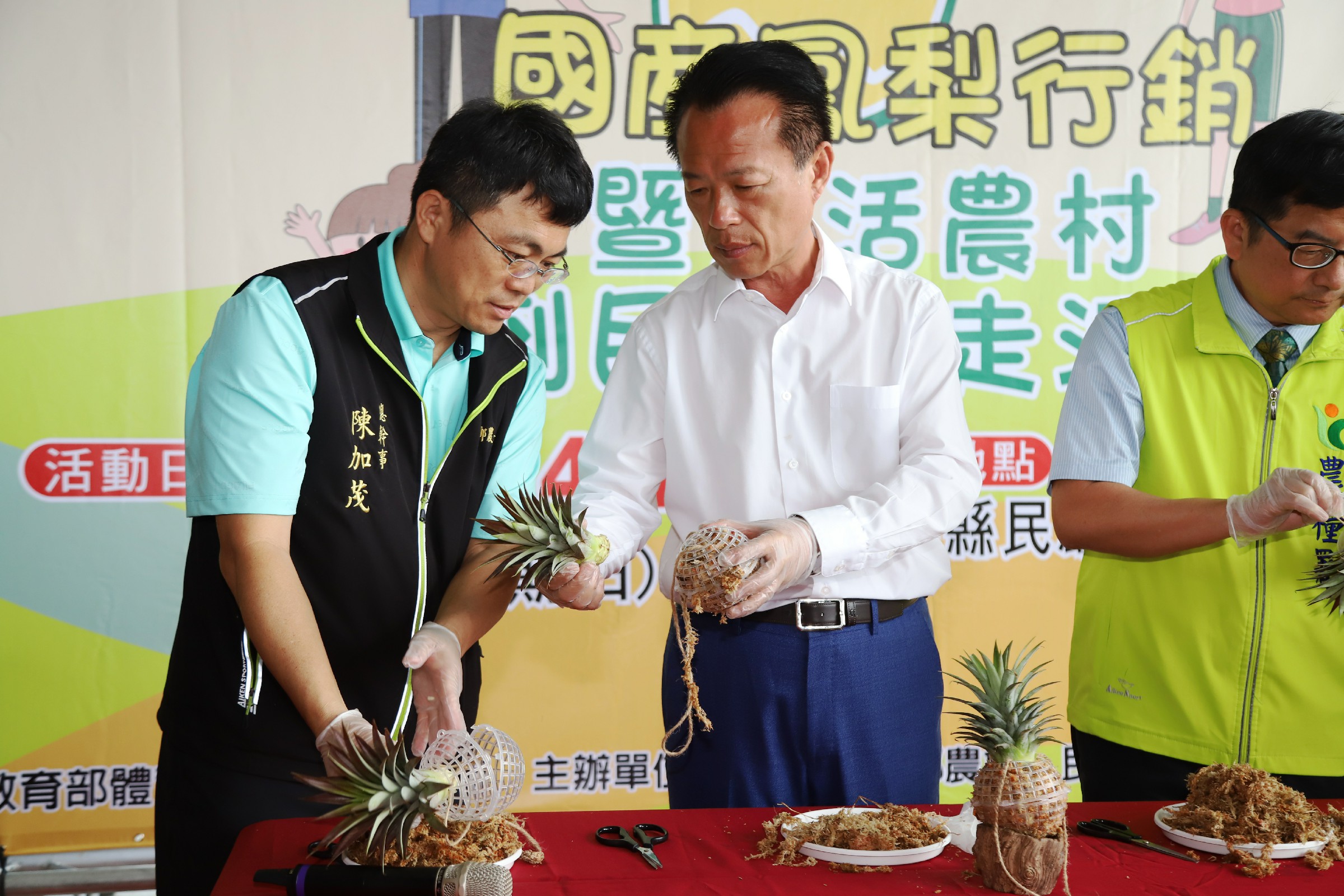 活動中,嘉義縣長翁章梁、嘉義縣農會總幹事黃貞瑜、民雄鄉農會總幹事陳加茂、嘉義縣議員林淑完今攜手農糧署代理署長蘇茂祥比手速切鳳梨,製作鳳梨米冰棒,將鳳梨、米、糖、水按比例加入果汁機,即可製作口味獨特的新甜品,品嚐後直誇好吃、透心涼,鳳梨尾還製作冠芽水苔球小物,模樣小巧可愛,擺在家裡的窗台或是辦公桌很療癒,凸顯鳳梨多種妙用。